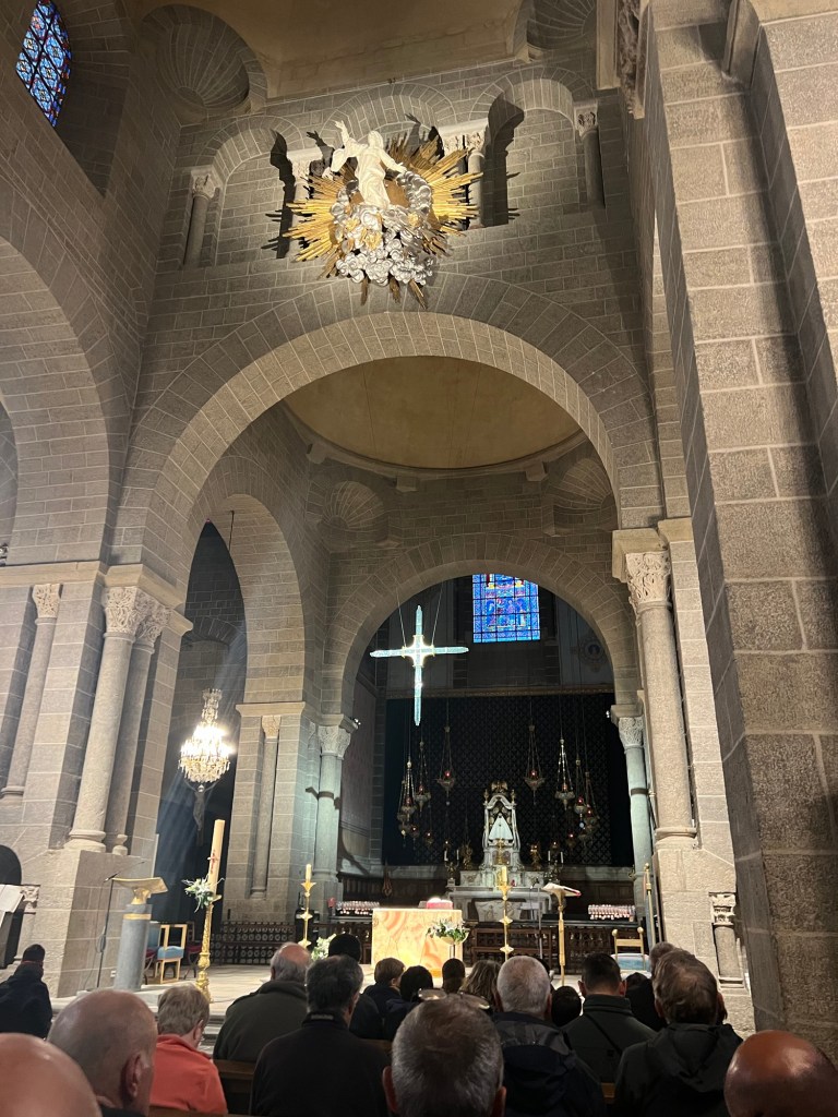 The day started at 5am, we woke up super early to pack our backpacks and get ready for the day! We left just after 6am to make our way to the Cathedral in Le Puy en Velay for the pilgrims mass. The pilgrims mass is a bit of a must do moment on this route, where at the end they lift the floor of the church and you can walk with your backpack down the famous steps to begin your journey.