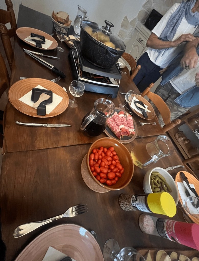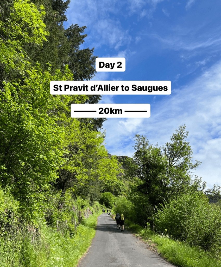 Luckily what goes up must come down, and we hobbled into Saugues after 8 hours on the trail with tremendous relief and accomplishment. The cozy Gîte, La Dentelle du Camino, welcomed us with open arms in a private room with bathroom, offering a much-needed respite from the day’s trial. The shared dinner with our fellow pilgrims was a simple and heartwarming, with potatoes, cheese, and a variety of meats.