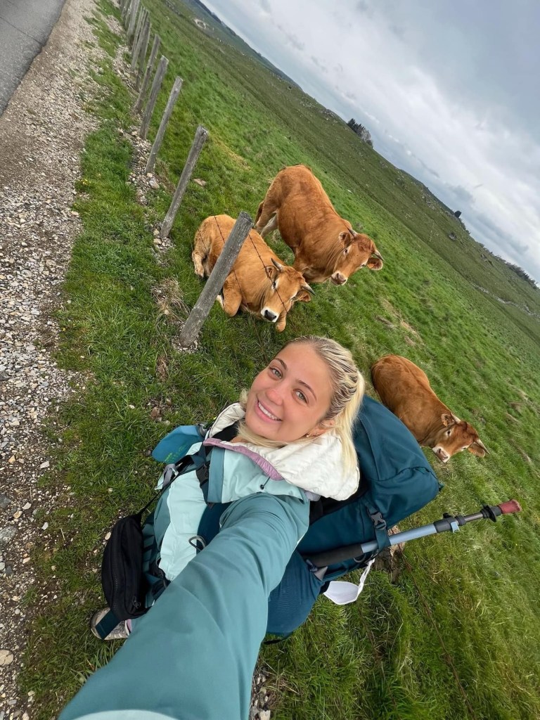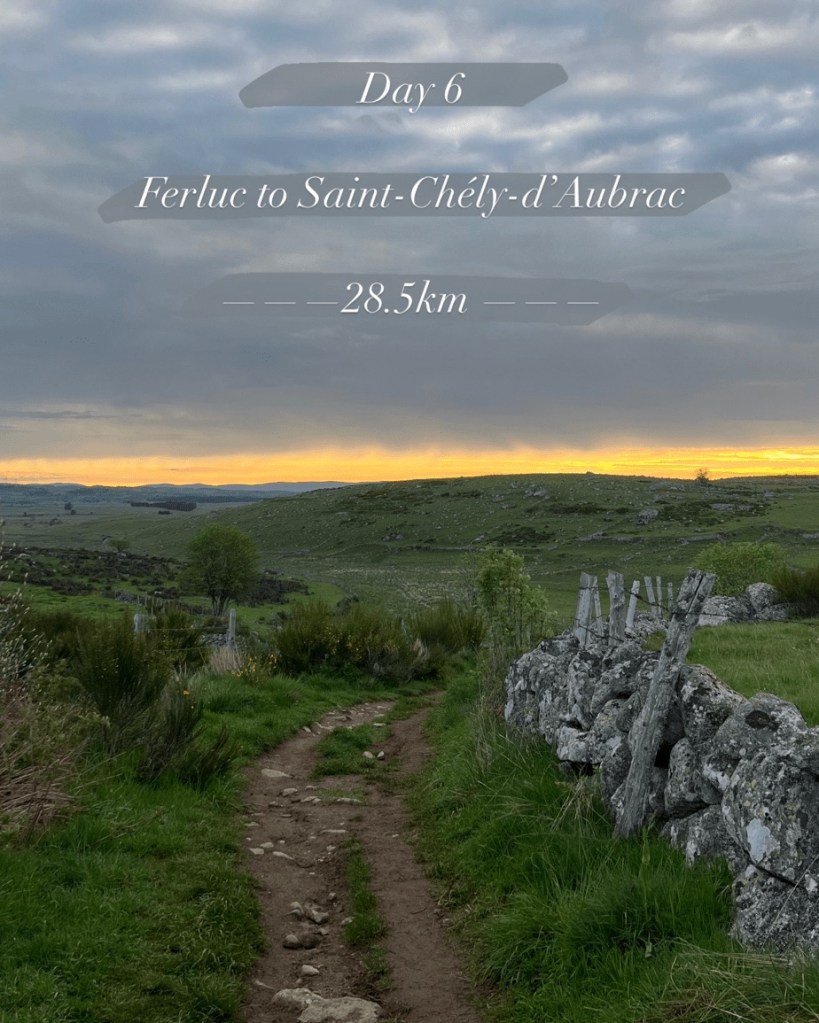 We woke up early after an amazing night’s sleep and reluctantly said goodbye to our wonderful hostess, Sonia. This was easily the best sleep I had so far, with a comfy bed, soft sheets and perfect temperature in the room. The day started early, and we finally got to see our first sunrise as we set off along the beautiful, rugged paths across the Aubrac, the dawn casting an orange glow.