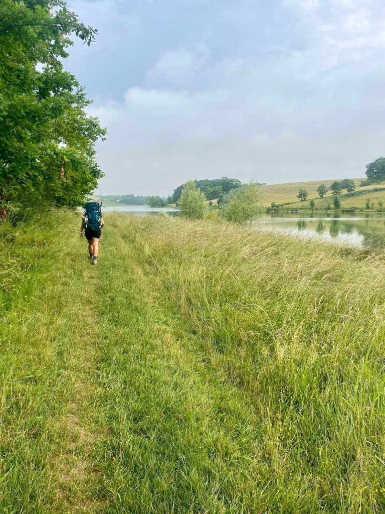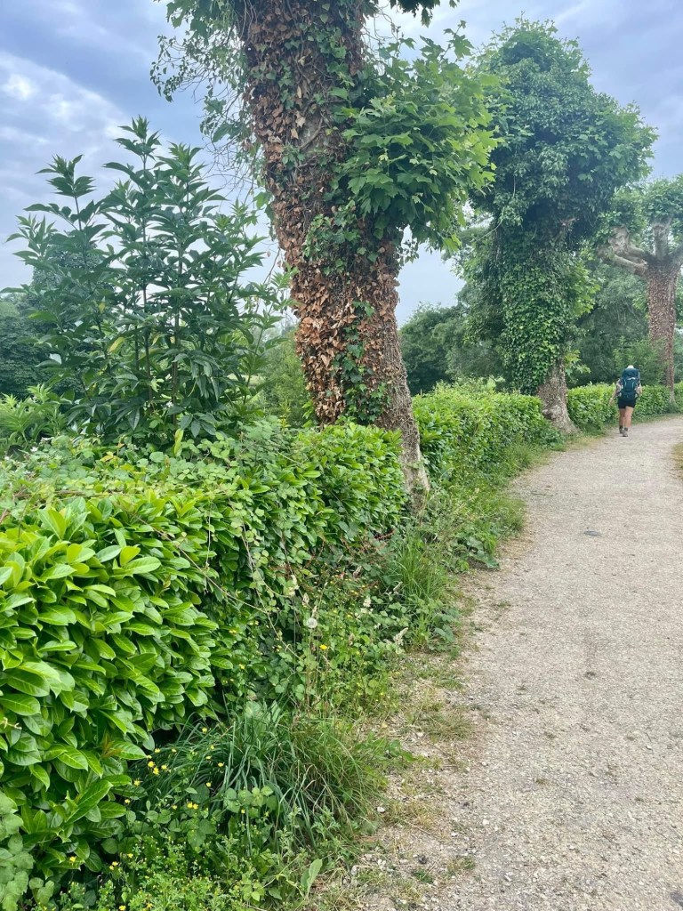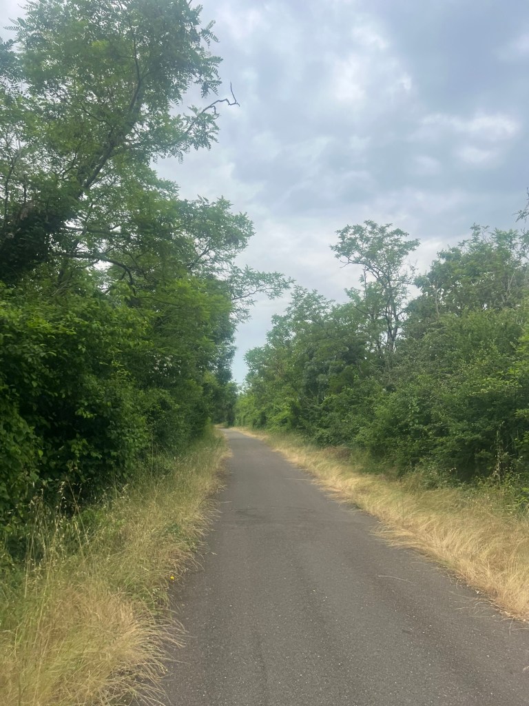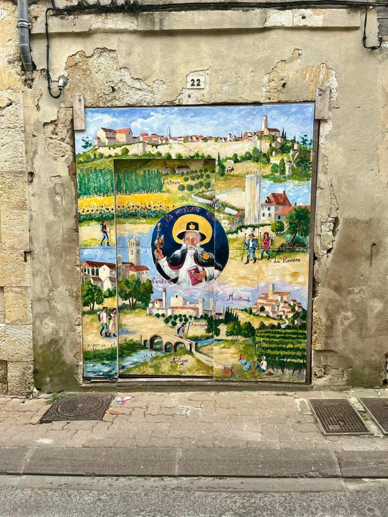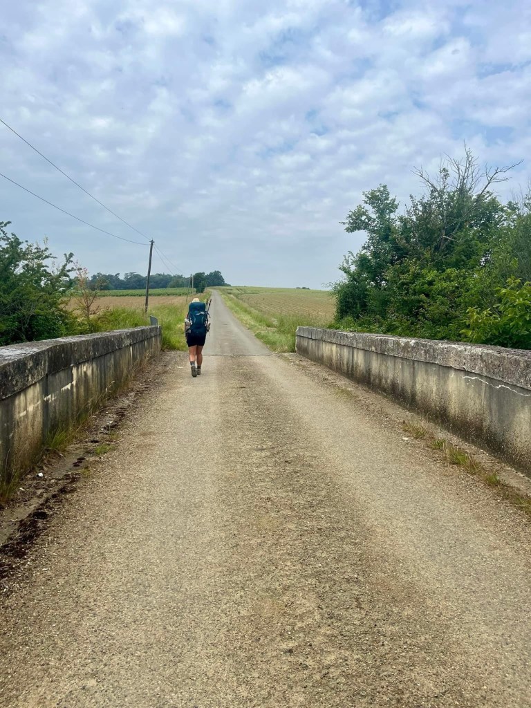 But things took a turn for the worse. We passed lovely wall murals as we left Condom, and the track followed the river for a while, lined with beautiful trees and old mansions were seen on the outskirts of town. We were so caught up in conversation that we missed a key marker and ended up on a cycle track, hemmed in by steep banks, trees, and thorn bushes. By the time we realized our mistake we had gone too far to backtrack, so we continued towards what seemed to be a cut-through road ahead that looked to link up to the GR65 when looking at it on the map. Sadly, the road passed over us on a bridge with no access up to it due to the steep banks. We decided to press on, finding a less dense spot to thrash through the trees and thorns, then had to trek back to the bridge on a farm road. This little detour added 4.5 kms to our already very long 29km day.