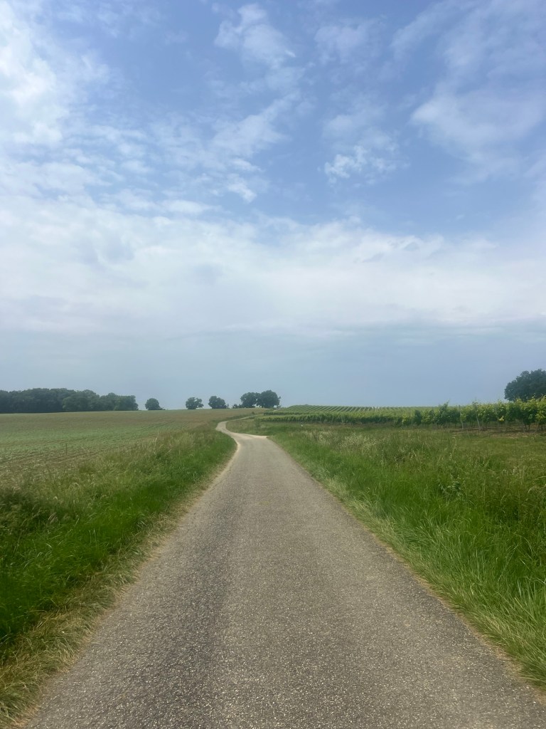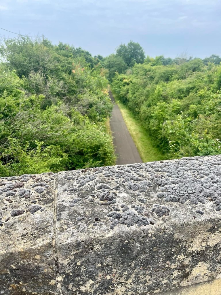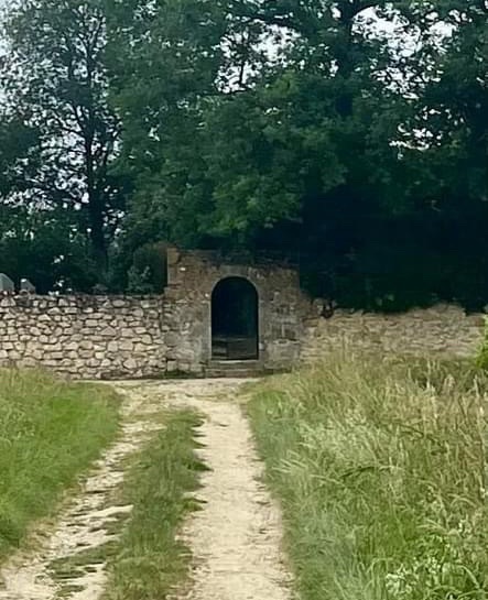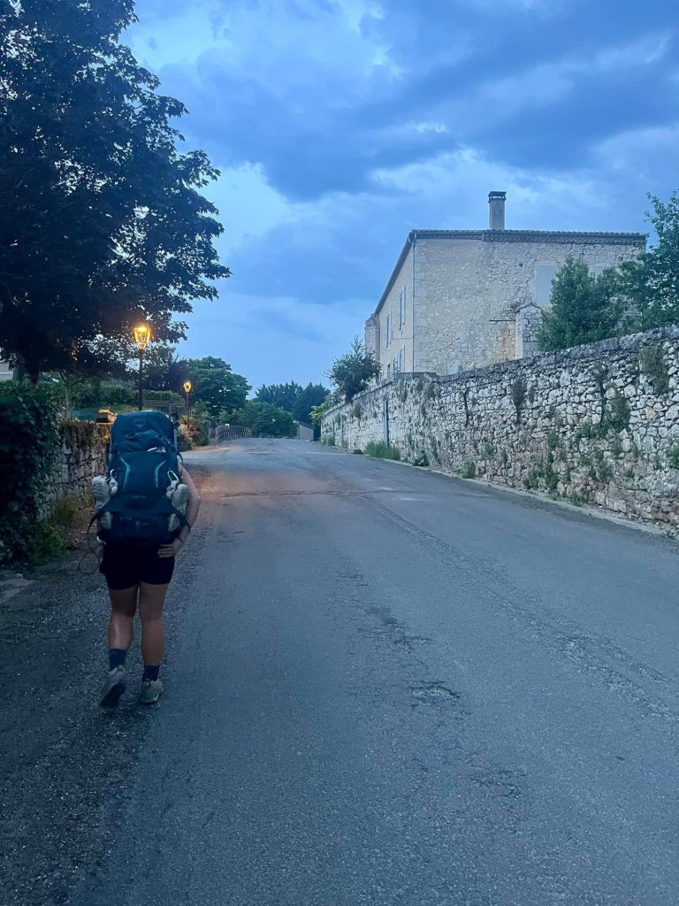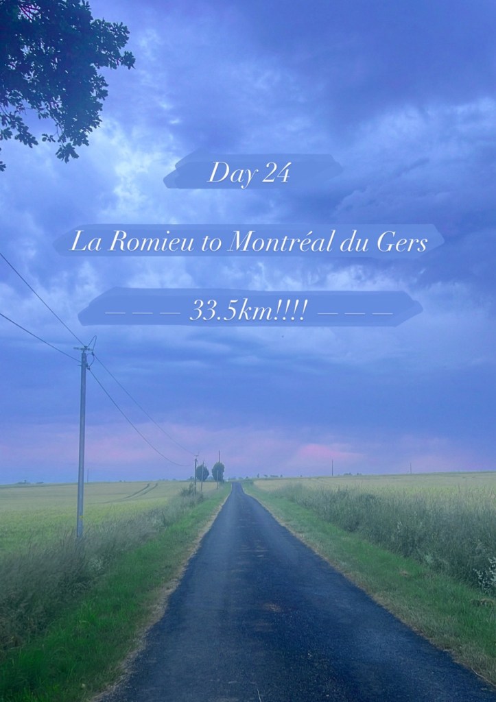 But things took a turn for the worse. We passed lovely wall murals as we left Condom, and the track followed the river for a while, lined with beautiful trees and old mansions were seen on the outskirts of town. We were so caught up in conversation that we missed a key marker and ended up on a cycle track, hemmed in by steep banks, trees, and thorn bushes. By the time we realized our mistake we had gone too far to backtrack, so we continued towards what seemed to be a cut-through road ahead that looked to link up to the GR65 when looking at it on the map. Sadly, the road passed over us on a bridge with no access up to it due to the steep banks. We decided to press on, finding a less dense spot to thrash through the trees and thorns, then had to trek back to the bridge on a farm road. This little detour added 4.5 kms to our already very long 29km day.