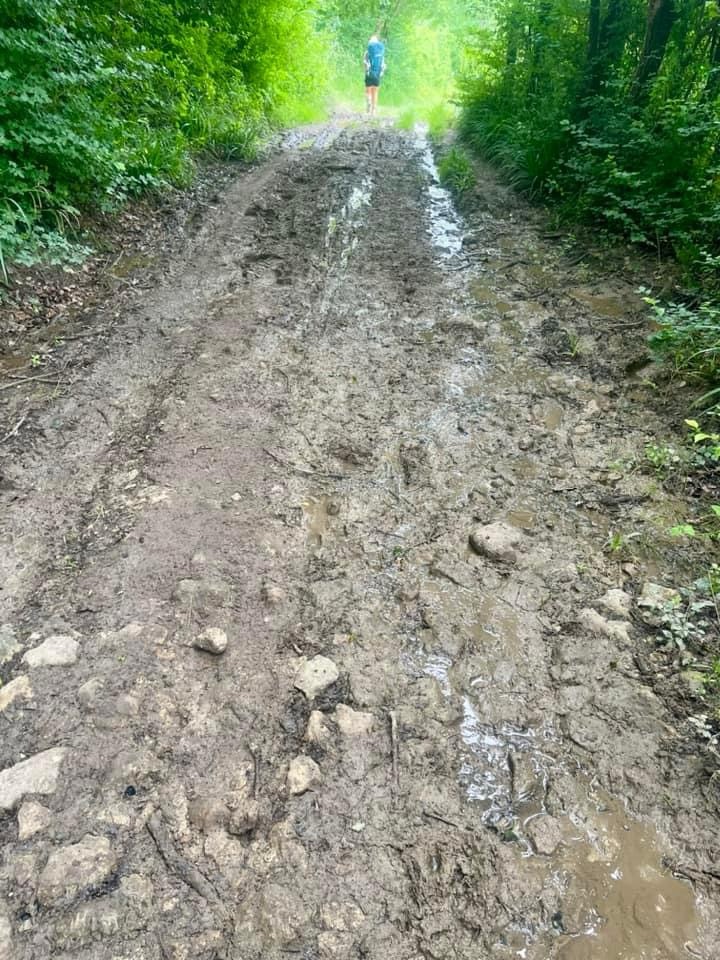 Our troubles seemed to multiply from there, but I suppose you can’t have rainbows without rain. The track descended into a low valley, followed a lake, and climbed and descended numerous times through wet, muddy forests. By this time, it was oppressively hot and incredibly humid, and negotiating the mud and stream crossings was slow and difficult. Swarms of thousands of gnats and insects made it hard to breathe and, despite applying DEET twice, we were covered in little gnats, some making it into our eyes and noses. There was no breeze, and the heat and humidity in these forested areas added to the very unpleasant conditions. There was little to see and no towns along the way to distract or motivate us, and our water supplies dwindled rapidly as the hours of walking across open vineyards in the midday heat accumulated. To add to our predicament, a passing tractor sprayed us with fertilizer pellets lol