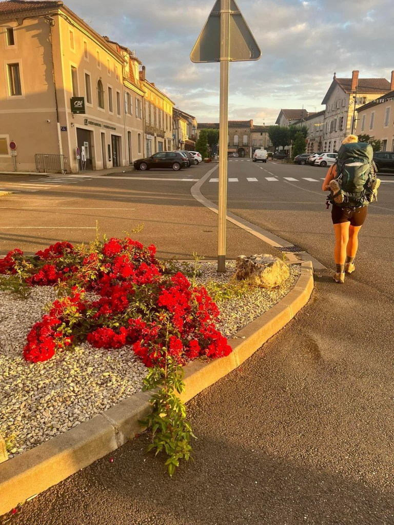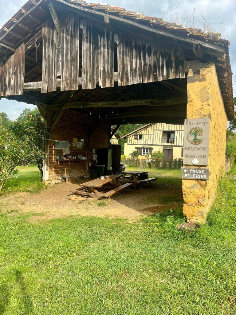 The last 9 kilometers were an easy walk through fields of corn and shady forests. On the last stretch into town, we followed an old railway line and came upon a little pilgrim rest area where we could get another stamp for our credential. I have been super vigilant in trying to fill ours before we get to St Jean Pied De Port – it’s not going to happen at this rate lol.