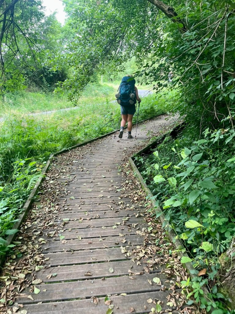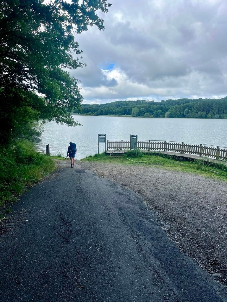 After about 6 km, we cleared the outskirts of the town. The sun came out, and the track passed through grassy fields before descending through a forest into a lake reserve. The path wound around the lake, with benches to sit and enjoy the peaceful views, before exiting via a wooden boardwalk and heading back up into the grass-covered hills. It felt liberating to be in the middle of nowhere, simply walking and enjoying the peaceful isolation.