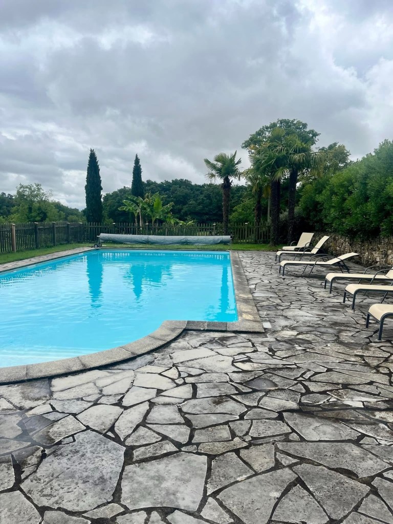 It was cool after overnight rain, with a forecast for more. After stopping at the supermarket, with our packs noticeably heavier, we crossed the l’Adour river and walked through the lovely town of Aire-sur-l’Adour. We visited the beautiful Saint-Jean-Baptiste d’Aire cathedral before tackling a steep uphill out of town. We passed Avenue Nelson Mandela, marked with a mural and photo of Nelson Mandela on a South African flag, sparking interesting conversation. Some of the houses along the way were modern with arches and wrought iron balustrades, while others were traditional A-frame styles with stone walls.